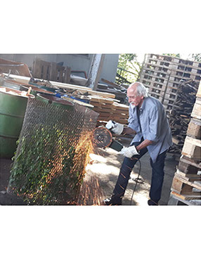 Abflexen eines Stücks Streckmetallzaun für die Arbeit im Atelier auf einem Schrottplatz in der Nähe des Grünen Bandes