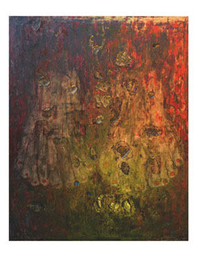 BARFUSS DURCH DIE HÖLLE / 2017 / Assemblage, Zeitungsstücke, Asche, Holzkohle, Schellack, Acryl auf Leinwand / 80x80
